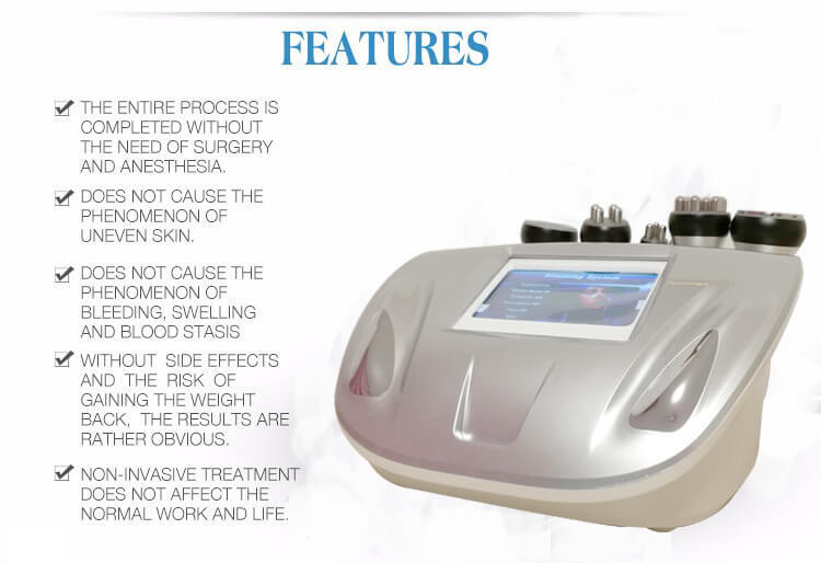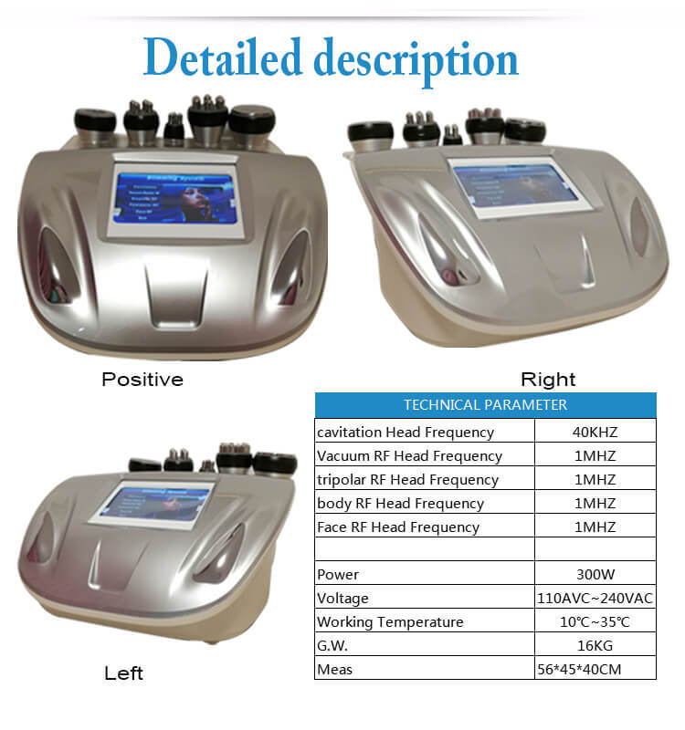 With collective strong sound wave head, strong sound wave of 40KHZ may be emitted to vibrate fat cells at top speed and produce numerous vacuum air pockets inside and outside the fat cells, robustly impact fat cells to generate introverted blast and disintegrate triglyceride into glycerol and free fatty acids. Then RF waves at frequency of 1M HZ is used for exhausting the integrated glycerol and free fatty acids through hepatoenteral circulation. Finally, vacuum RF and energy electrode are used for positioning and tightening fat. In physics, it is known as "cavitation". Micropore introverted blast inside and outside cell may lead to enhanced molecular motion and a higher energy level and this will finally cause fat cell rupture and thereby achieve the effects of body building and losing weight.
